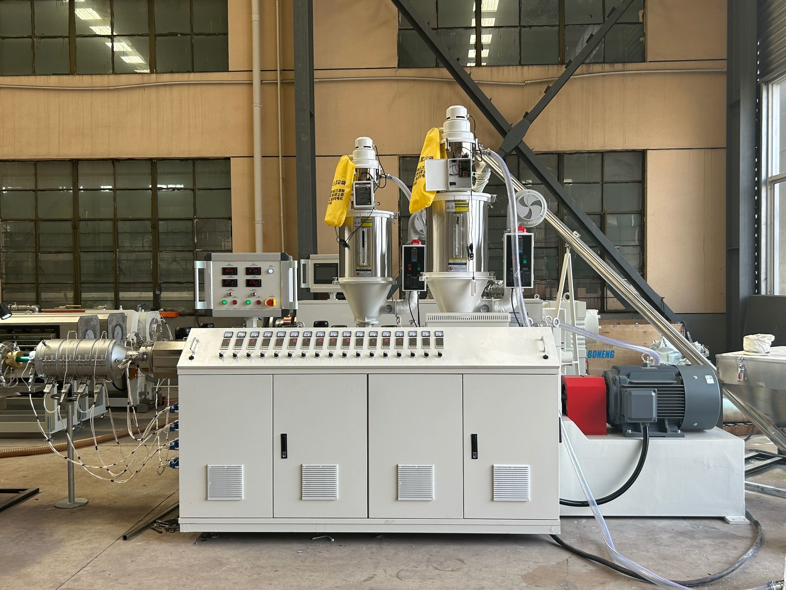 วัสดุแพร่ (PPR/PVC pellets, additives) จะถูกใส่เข้าไปในกระบวนการและผสมกันอย่างเท่าเทียมกัน