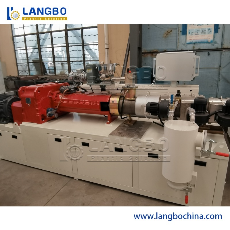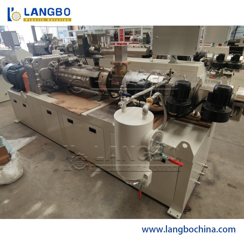 พาวเวอร์พีวีซี + สารเสริม → การผสมผสาน → การให้อาหารกับสปริง → เครื่องบดสองสกรู → หม้อและเครื่องปรับขนาด