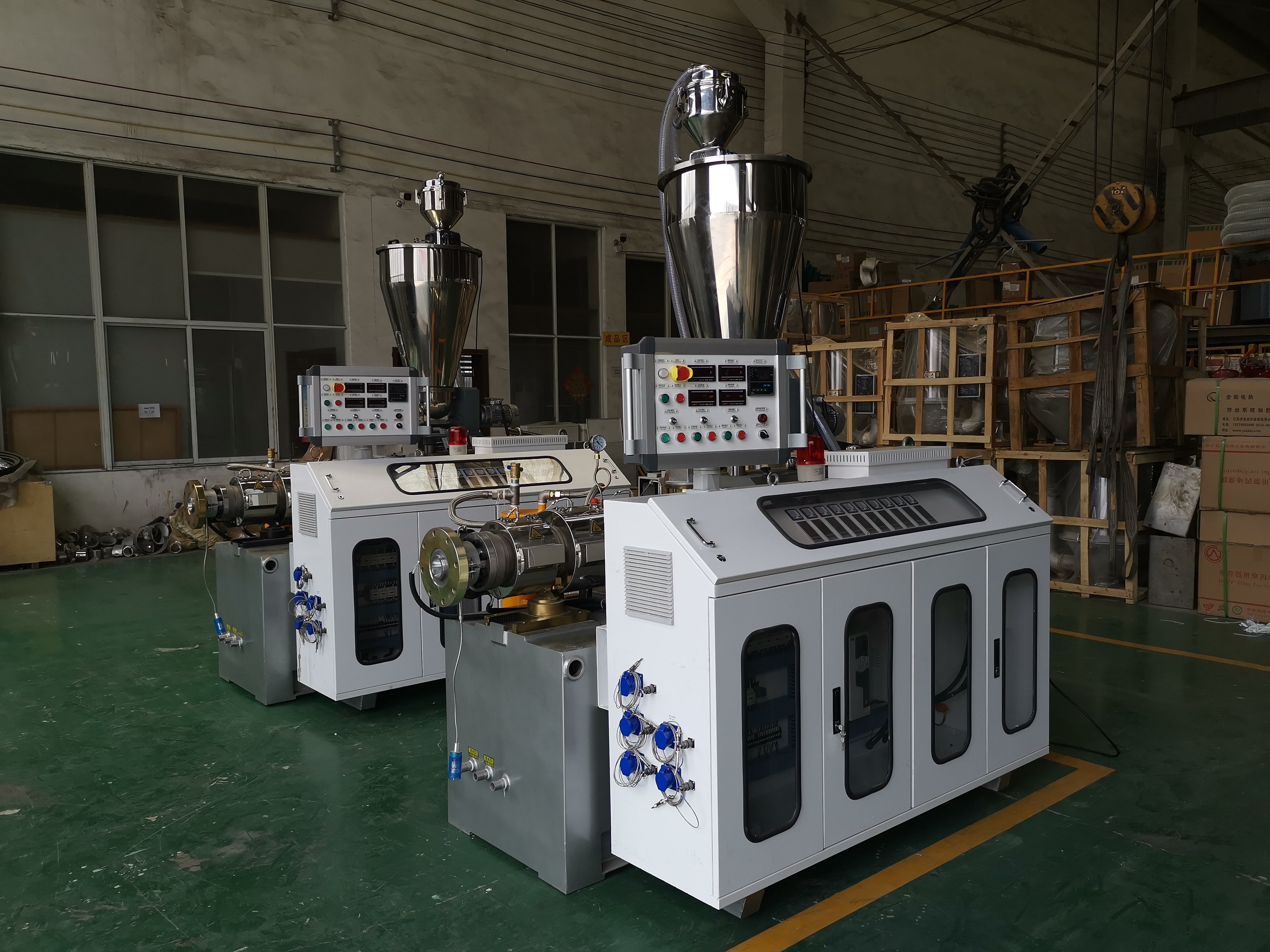 ประกอบด้วยเครื่องอัดรีดสกรูคู่ทรงกรวย แม่พิมพ์ ถังสอบเทียบ ถังทำความเย็น ลากออก เครื่องตัด และ stacker